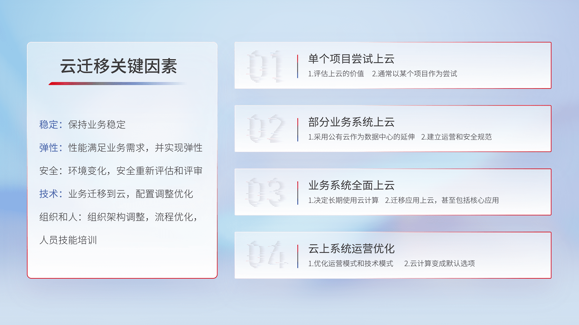 结合实际业务,,,,从规划设计、、、云平台选型、、、云原生改造、、、、数据迁移、、、、集成交付,,迁移全过程为客户识别最佳上云路径,,,,做好风险识别管理,,设计网络架构、、、、身份权限、、安全审计合规、、、操作审计、、、、日志审计、、、监控告警策略、、、多站点容灾设计等,,,,对云上基础设施进行整体规划,,提升IT治理水平,,,以满足弹性、、、、高可用、、、高性能的需求。。。