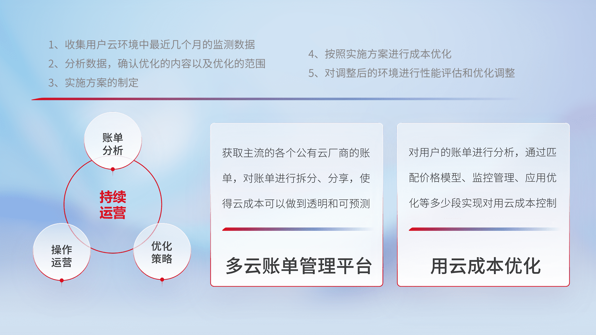 通过多云纳管,,以统一的资源数据模型把客户的云资源进行抽象和封装,,,进而实现对多云资源的统一操作,,,保障云资源管理的可靠性、、稳定性与可用性。。量身定制化运维内容,,,,配置、、、开发运维、、、补丁管理、、、、备份、、监控、、、、认证和访问管理、、审计和日常巡检等,,,保障在用云过程中的可靠度,,,稳定度以及高可用率。。