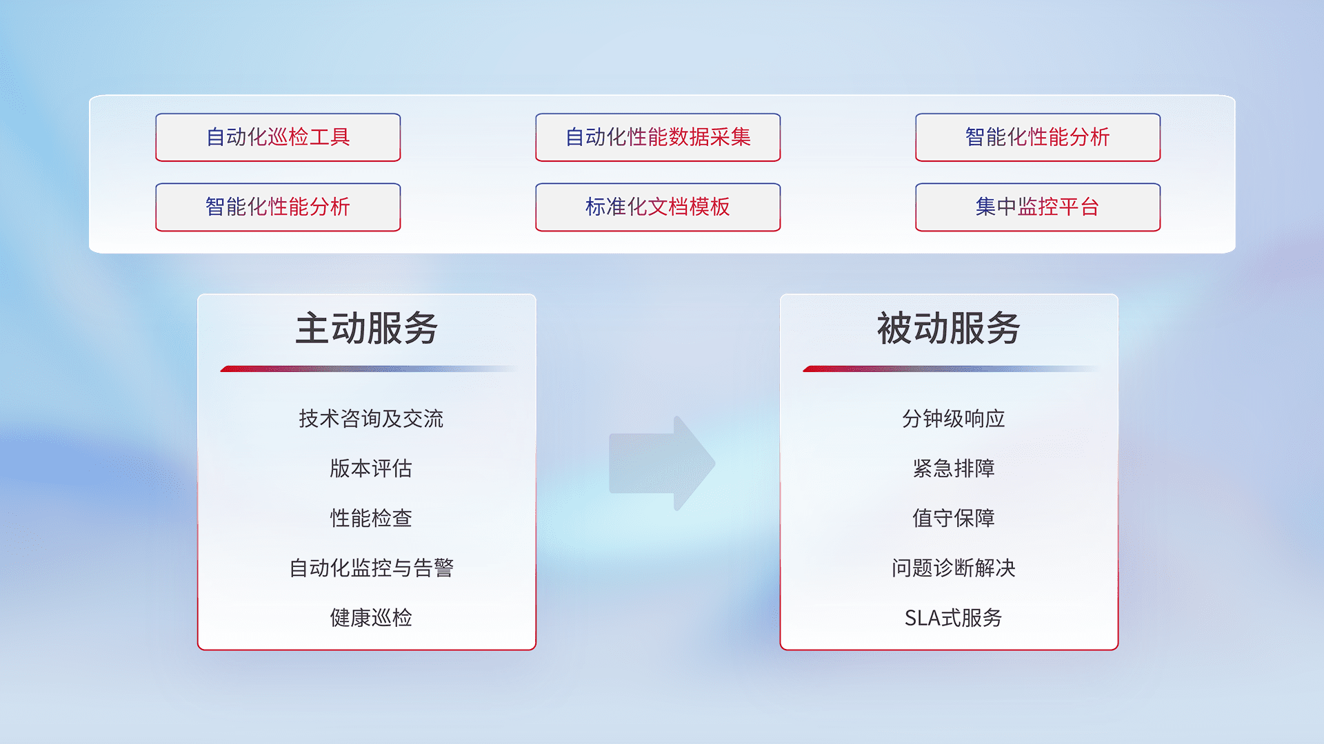 智能化工具和标准化文档,,,保障服务质量,,提供主动服务(包含技术咨询、、、版本评估、、、性能检查、、自动化监控与告警、、、健康巡检)和被动服务包含(分钟级响应、、紧急排障、、、值守保障、、问题诊断解决、、SLA服务)。。。